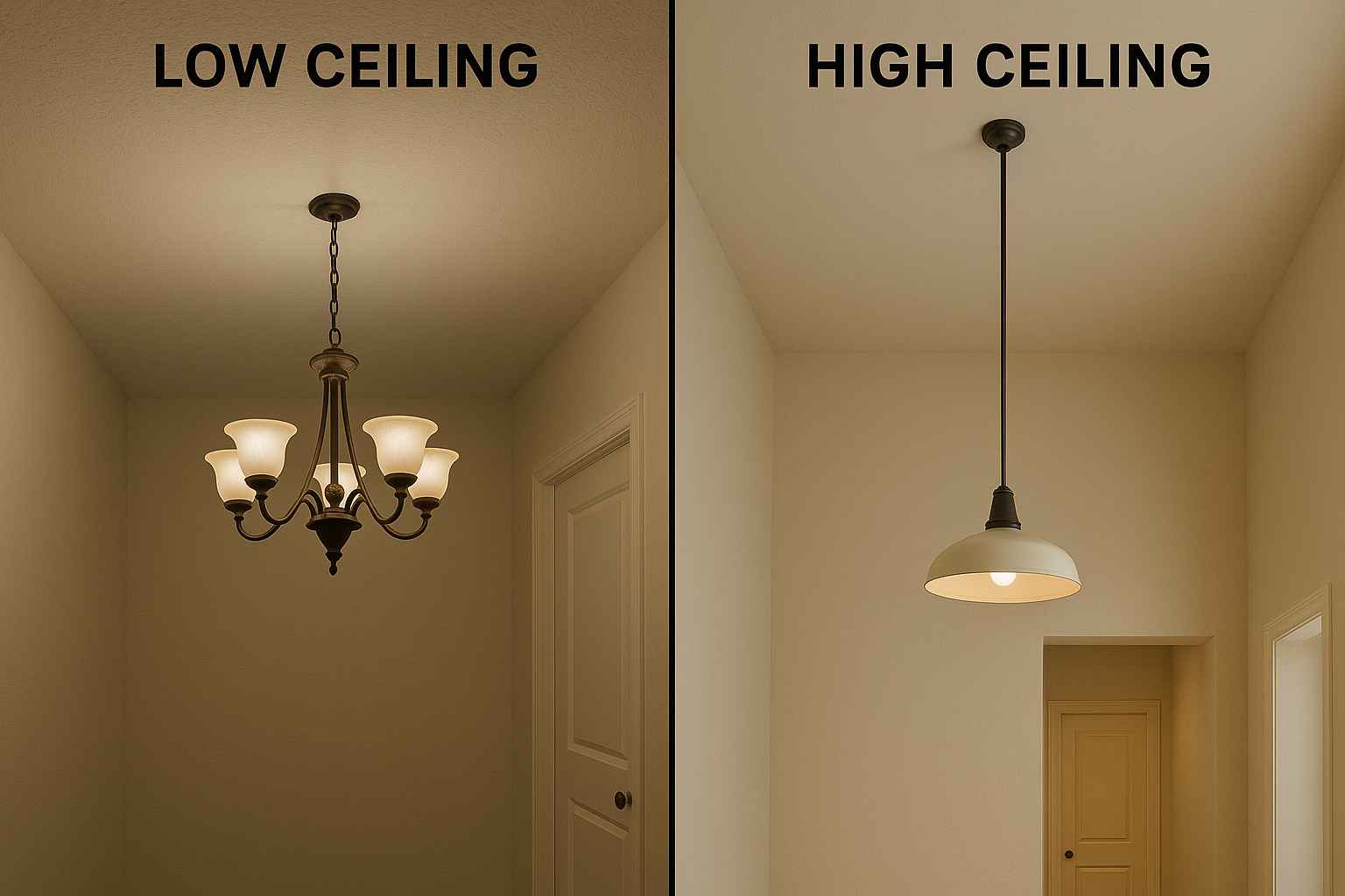 If your ceilings are low, a giant chandelier or a long pendant can feel like it’s crowding the room – even making you bump your head! On the flip side, super-high ceilings need bigger fixtures to fill the space and avoid looking tiny or lost. The key is matching your lighting to your room’s height so that it feels balanced.