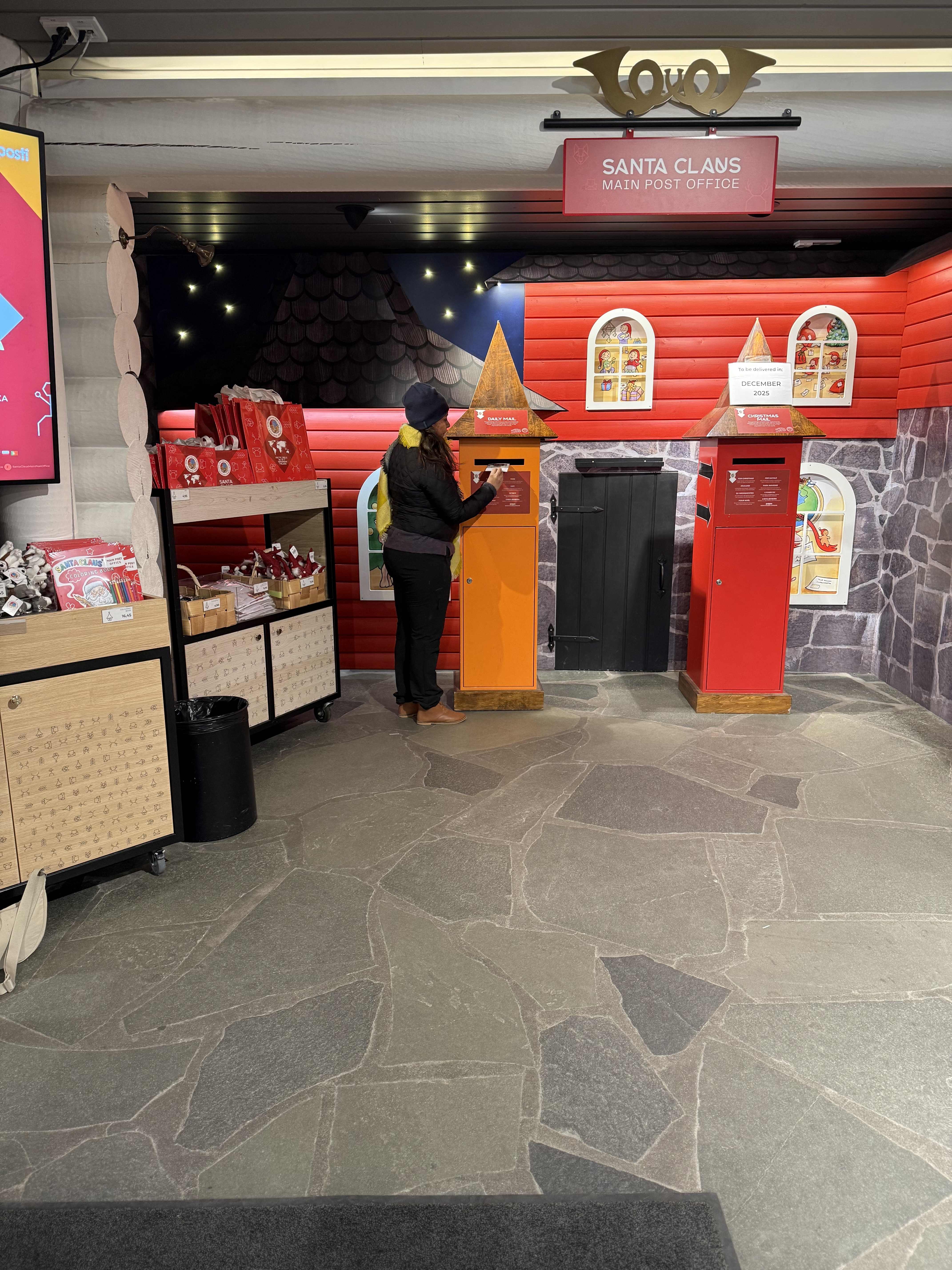 Next, we warmed up with some hot chocolate at a nearby restaurant and made our way to the Arctic Circle Post Office to send postcards to our loved ones. Standing right on the Arctic Circle line—felt surreal.